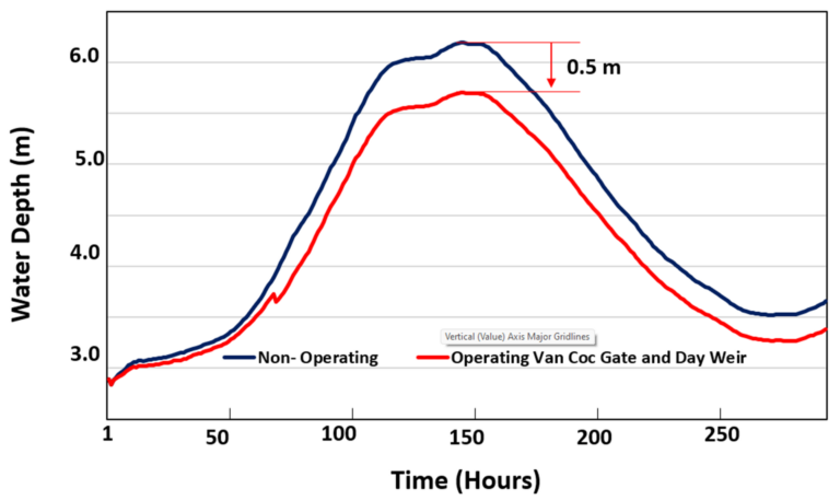 The water depths near Van Coc Gate and the Long Bien warning station are illustrated in Figures 2 and 3. The water levels decrease significantly from the operating to non-operating scenarios of the hydraulic structures. The decrease is up to 0.5 m in front of the Van Coc Gate and 0.2 m at the warning station