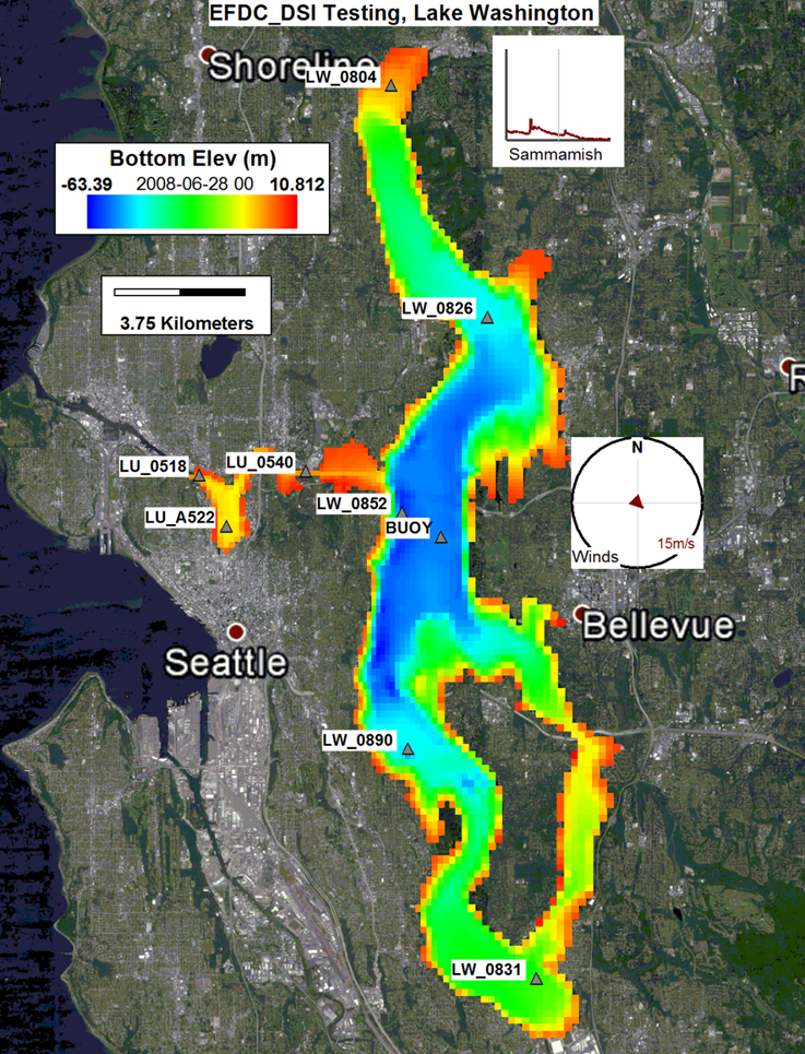 A paper using this example was presented at the 11th International Conference on Hydrodynamics (ICHD 2014), October 19 – 24, 2014, Singapore, and may be downloaded from this website (click here). This paper uses Lake Washington as a demonstration and verification of Sigma-Zed and EFDC+.