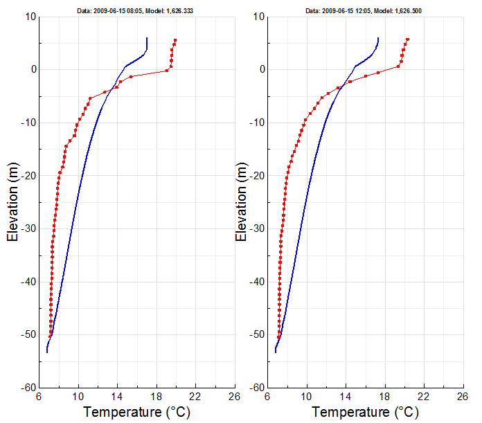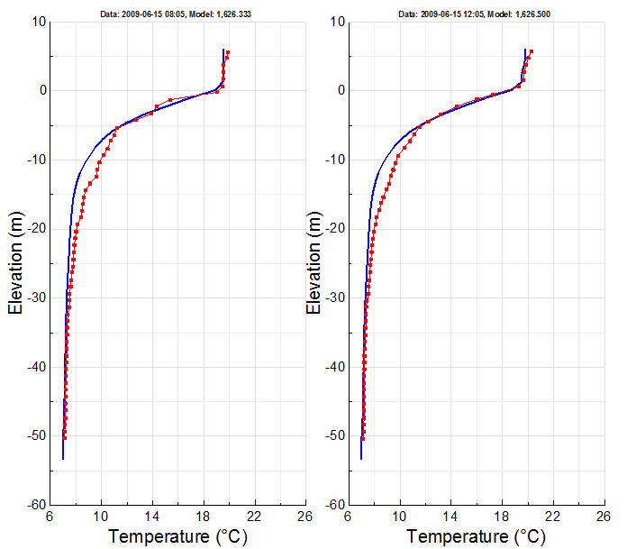 The extremely accurate simulation of vertical variation of temperature by EFDC+ using Sigma-Zed is demonstrated below. This compares the vertical profiles of model output (blue) with measured data (red) for temperature for the new Sigma-Zed (Figure 2). In contrast Figure 3 compares the vertical profile of model output (blue) with measured data (red) for the conventional Sigma Stretch approach. The Sigma-Zed clearly performs better and has a run time shorter than Sigma Stretch (3.5 hours vs 12 hours for a one year simulation).