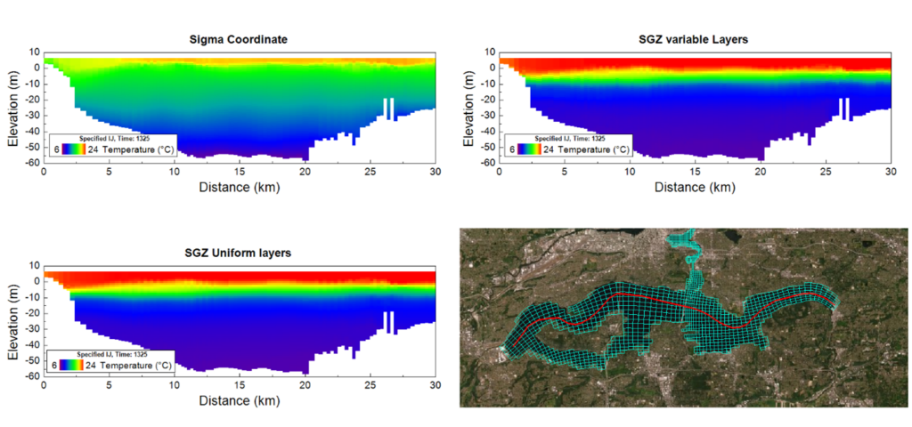 Notice that the Standard Sigma option produces poor vertical temperature stratification (Figure 3). Conversely, Figure 4 demonstrates that the temperature distribution under the SGZ option offers more accurate results. Additionally, using SGZ significantly reduces the total number of computational cells in the water column, reducing model running time.