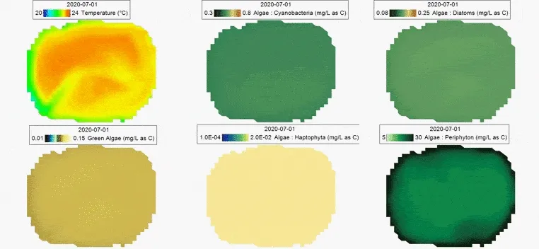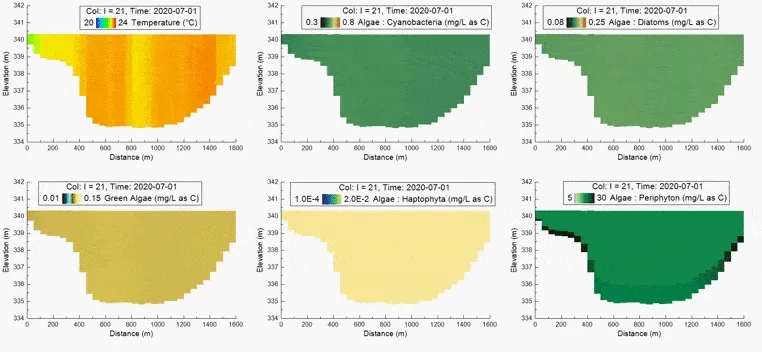 Animations illustrating the change in temperature and concentrations of different algal classes modeled using EFDC+10.3 (testing version) in Pearl Lake, Minnesota, using EFDC+ (Left: plan view. Right: profile view).