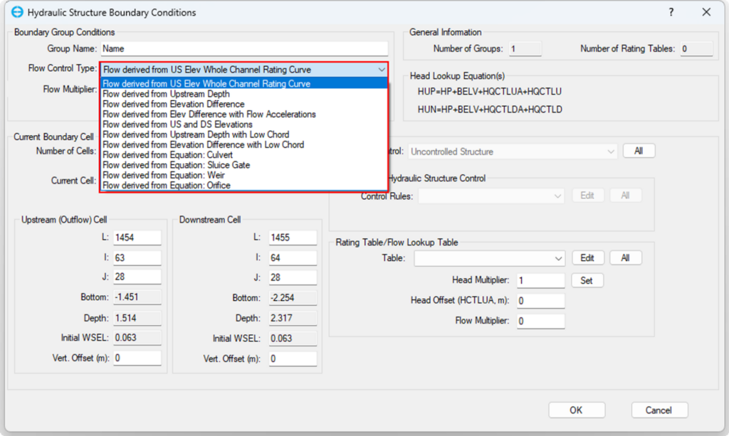 In the Hydraulic Structure Boundary Conditions form, click on the Flow Control Type, and the drop-down menu will be displayed. There are various options based on rating curves or equations, as illustrated in Figure 1. The first seven options use a rating table or flow lookup table to describe the relationship between head and flow. These options are based on upstream elevation, upstream depth, elevation difference, elevation difference with flow accelerations, upstream and downstream elevations, upstream depth with low chord, or elevation difference with low chord. The remaining four options, which determine flow based on equations, are applicable in cases involving culverts, sluice gates, weirs, or orifices.