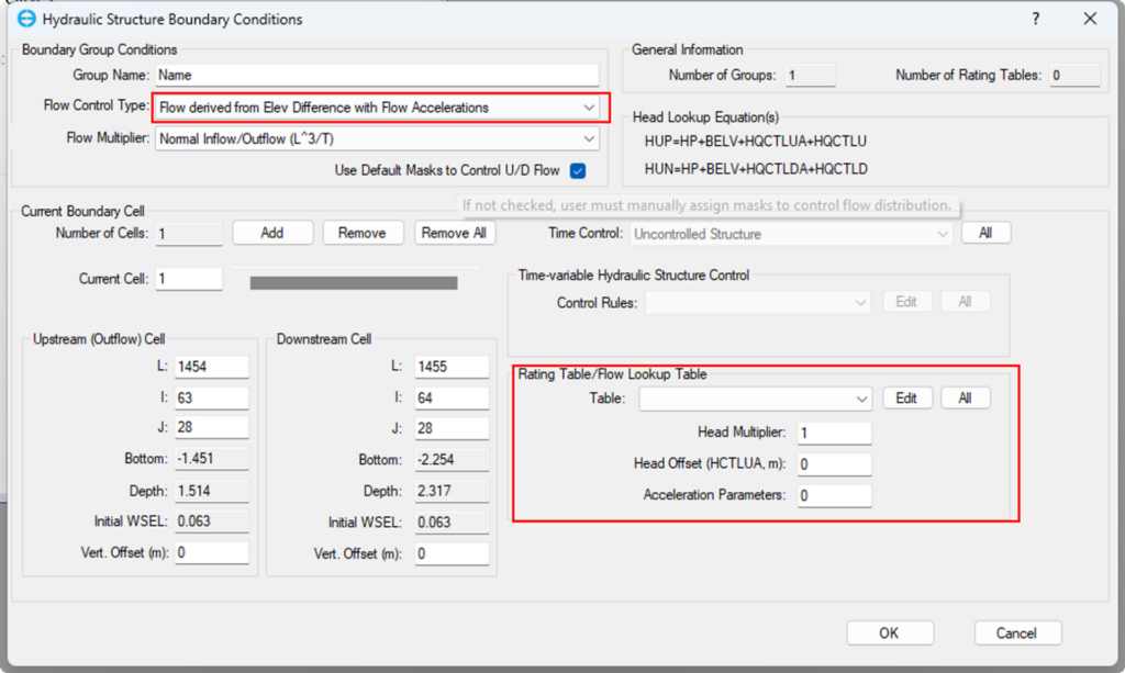A rating table or flow lookup table is used to determine the flow rate (discharge) of water based on a particular water surface elevation, selected via the Flow Control Type menu. For example, if Flow derived from US Elev Whole Channel Rating Curve is selected, EEMS allows setting a boundary using a single rating curve to represent the river. This option works like a flow table or time series, with an adjustable flow multiplier across different cells. A downstream cell for flow return can be set in the Downstream Cell frame. If left blank, EE ignores the downstream end. Additionally, the Head Multiplier, Head Offset, and Flow Multiplier must be specified, as shown in Figure 2.