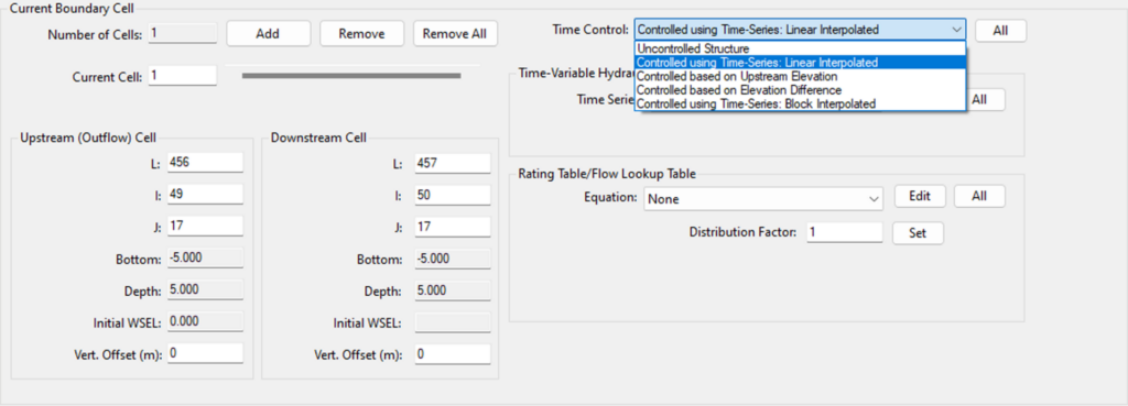In the Time Control option, hydraulic structures can be either controlled or uncontrolled. Controlled hydraulic structures have mechanisms that allow operators to regulate the flow of water. These mechanisms can include movable parts like gates that can be adjusted to control water levels and discharge rates like locks. Uncontrolled hydraulic structures do not have mechanisms to regulate flow. The flow through these structures is determined by the water level upstream and the physical characteristics of the structure. For uncontrolled structures, basic parameters must be provided as described above (Figure 4). However, for controlled hydraulic structures, a rule table must be identified, as shown in Figure 6.