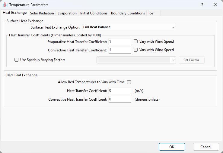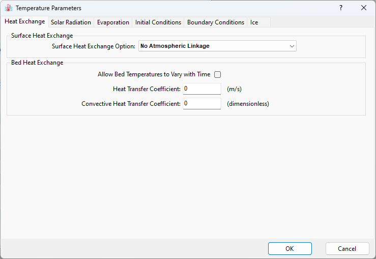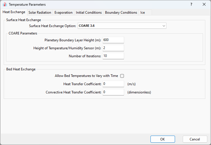 The bed heat exchange configuration can be accessed under the Bed Heat Exchange option. The user can set it to allow temporal variation of bed temperatures by checking the box. A Heat Transfer Coefficient larger than 0 enables the heat flux between water and the sediment bed. Attention should be given to the unit conversion of this coefficient from W/m2/C to m/s by dividing by water density and water specific heat. The Convective Heat Transfer Coefficient is dimensionless and used to simulate the heat exchange at the sediment bed.