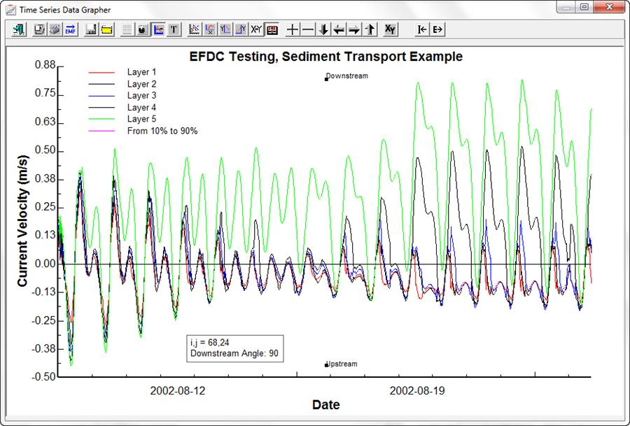 Did you know that EFDC+ Explorer has a Downstream Velocity Projection feature? This feature allows the user to specify an orientation angle (degrees clockwise from north, looking downstream) in order to plot velocity magnitude of the upstream and downstream flow during the EE data extraction. It is accessed by RMC when the Velocities viewing option is selected as shown in below: