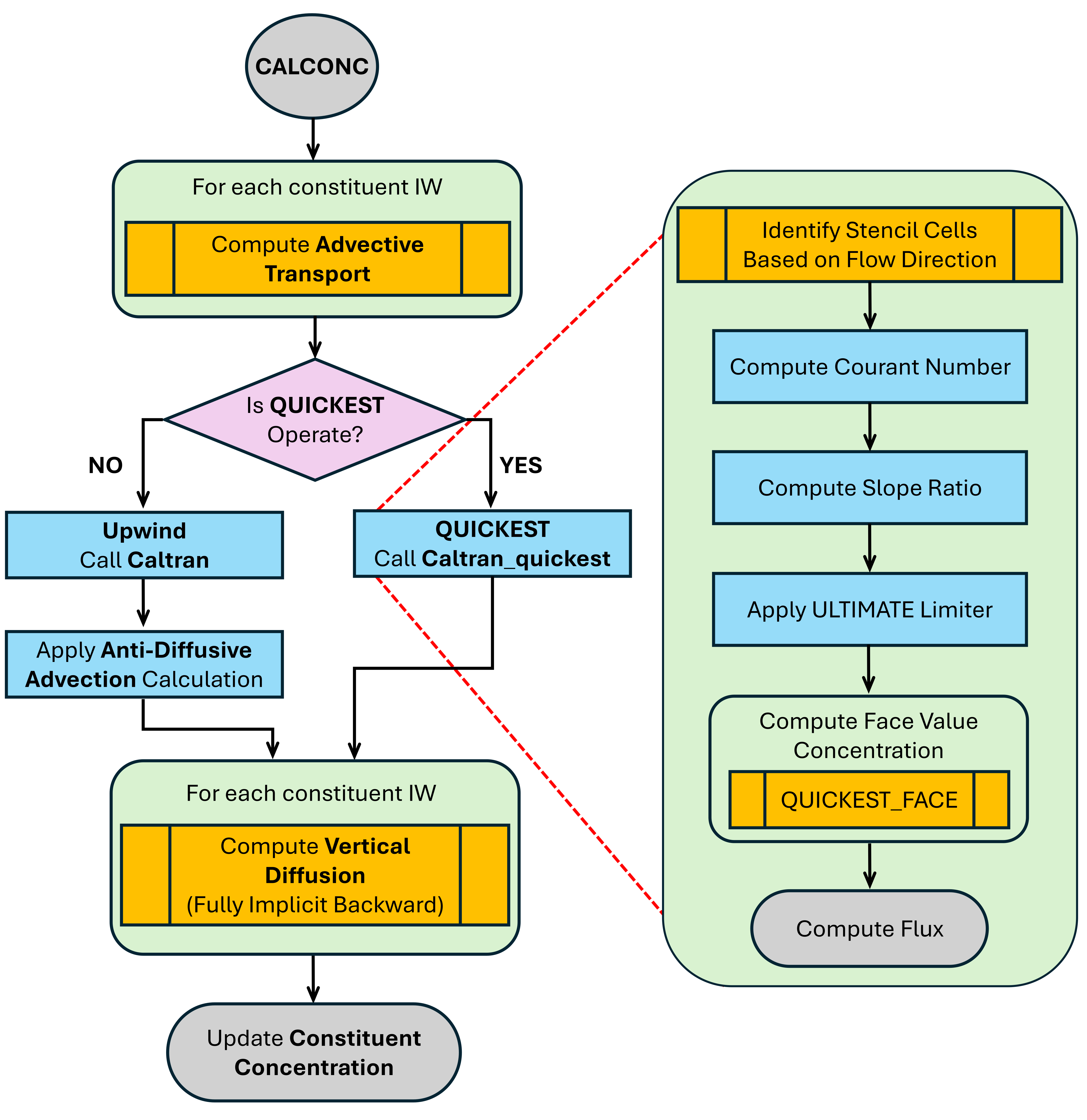 EEMS 12.5 introduces the ULTIMATE-QUICKEST scheme for advective transport in EFDC+, using quadratic interpolation to achieve third-order accuracy and reduce numerical diffusion while maintaining numerical stability.